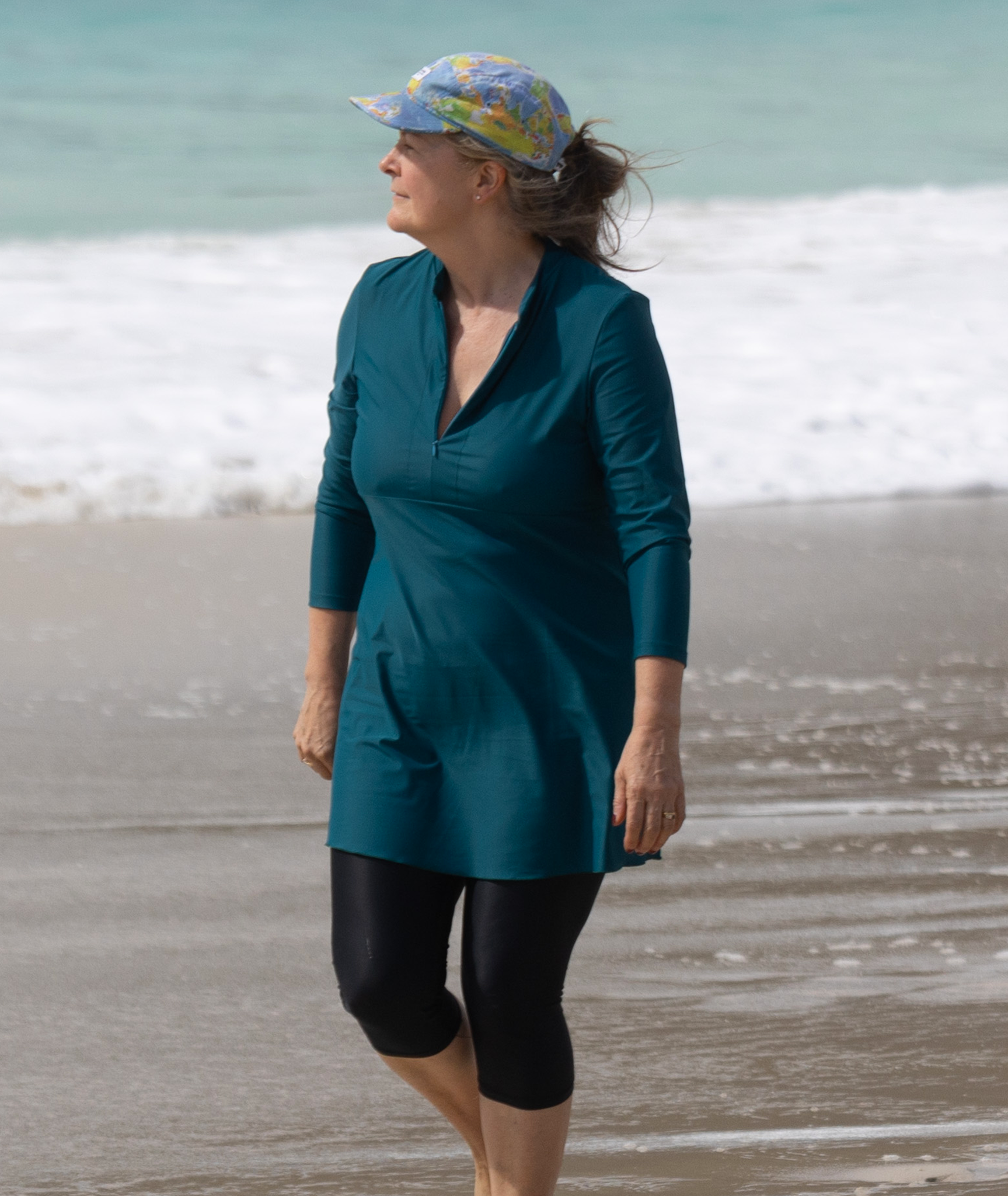 As an expert in swimwear for real women, Suncheeter presents the ultimate functional and stylish Swim Dress. With a flattering a-line design and functional zip neck, it covers the bum and softens the tummy. It keeps its shape when wet and keeps you comfortable while swimming. The quick dry fabric is also chlorine and salt water resistant, ensuring durability. Stay cool and protected with the UPF50+ sun protection.